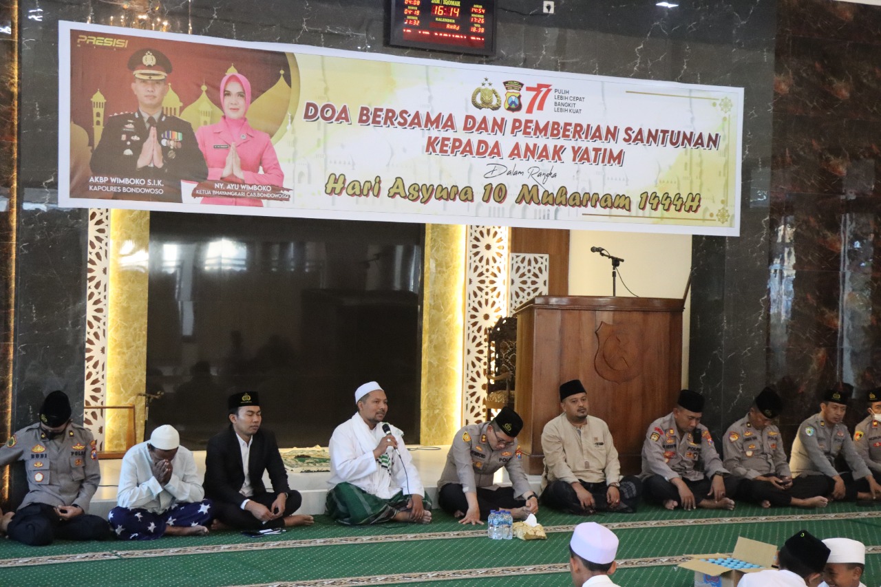 Kapolres Bondowoso mengatakan, bulan Muharram memiliki sejumlah arti dan keutamaan sehingga umat Islam dianjurkan untuk memperbanyak amalan. Oleh sebab itu, hendaknya semua umat beragama Islam mengisi momen tahun baru Islam ini dengan memperbanyak berdoa kepada Allah SWT, untuk memperingati hari Asyura polres Bondowoso melaksanakan kegiatan doa bersama dan menyantuni anak yatim yang dilaksanakan di masjid Al Fajri Polres Bondowoso pada hari Minggu 07