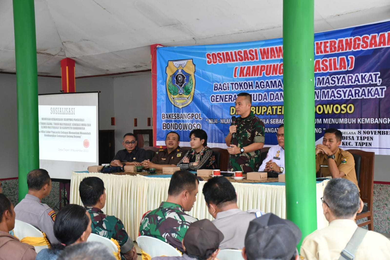 Bondowoso, KLIKTODAY.CO.ID – Komandan Distrik Militer (Dandim) 0822/Bondowoso Letkol Arm Suhendra Chipta, M.Tr.Hanla., hari ini hadir di Balai Desa Tapen Jl. Raya Situbondo Ds. Krajan Kec. Tapen Kab. Bondowoso guna memberikan penguatan dan pembinaan dengan menanamkan nilai–nilai wawasan kebangsaan bagi warga binaan kepada Tokoh Agama, Tokoh Masyarakat, Generasi Muda dan Elemen Masyarakat dengan tema “Nilai – Nilai Luhur Pancasila sebagai Momentum Menumbuhkan Semangat Gotong Royong”, Selasa (8/11/2022).