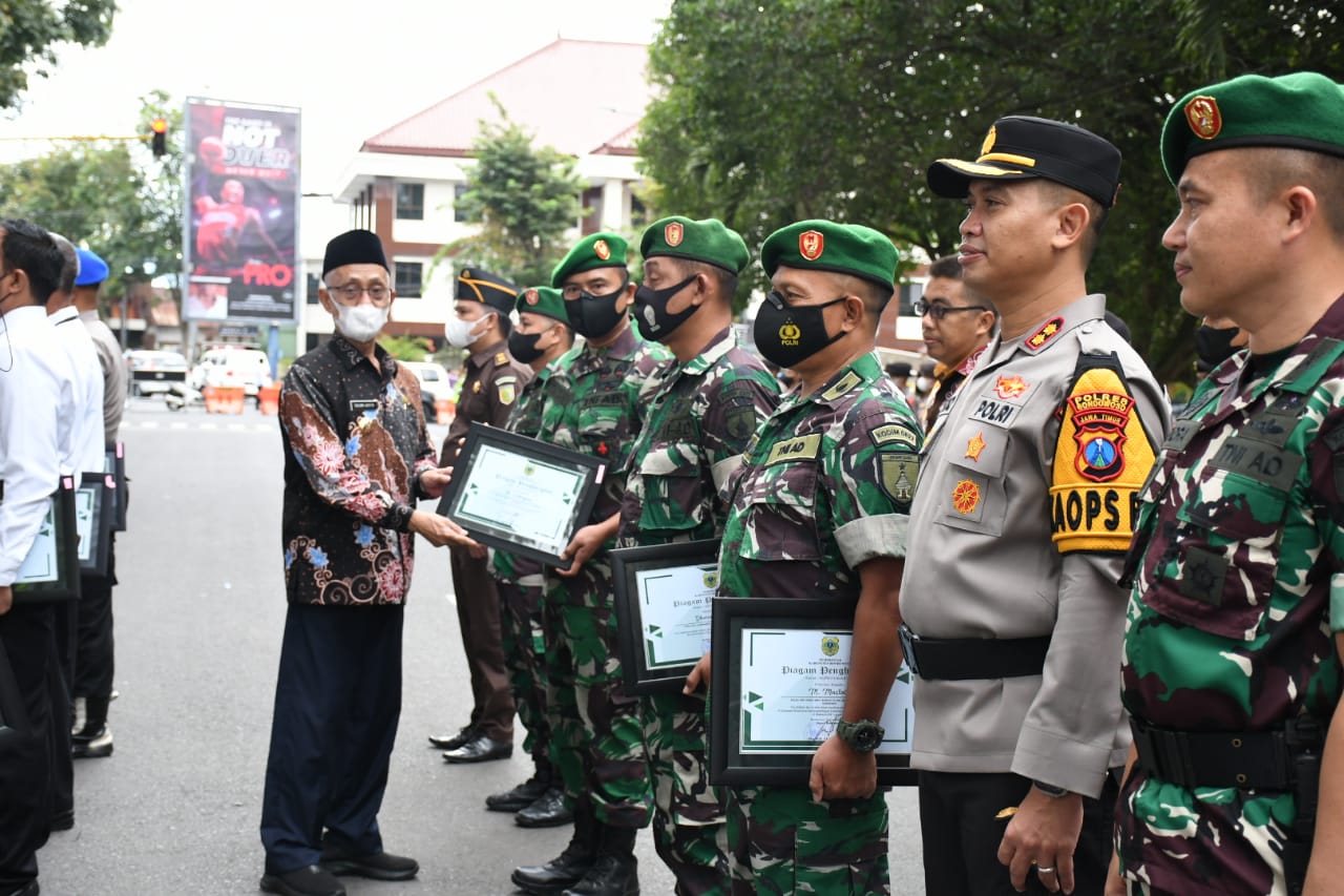 Penyerahan penghargaan dilaksanakan dalam kegiatan apel gelar pasukan pengamanan operasi lilin Tahun 2022 bertempat di depan Pendopo Bupati Bondowoso Jl. Letnan Karsono Bondowoso, Jatim, Kamis (22/12).