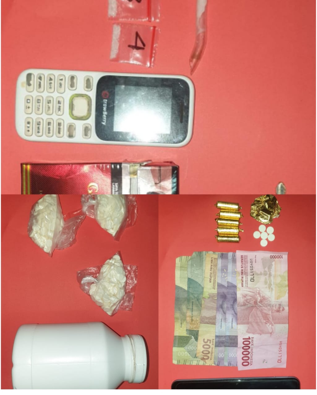 ” Dalam kejadian tersebut berhasil diamankan barang bukti berupa: 300 (tiga ratus) Butir pil logo Y warna putih, Uang tunai Rp. 250.000,- (dua ratus lima puluh ribu rupiah), 1 (satu) buah Kaleng pil warna putih dan 1 (satu) Unit HP merk Vivo type V2027 warna putih, “tutut Kasat Resnarkoba.