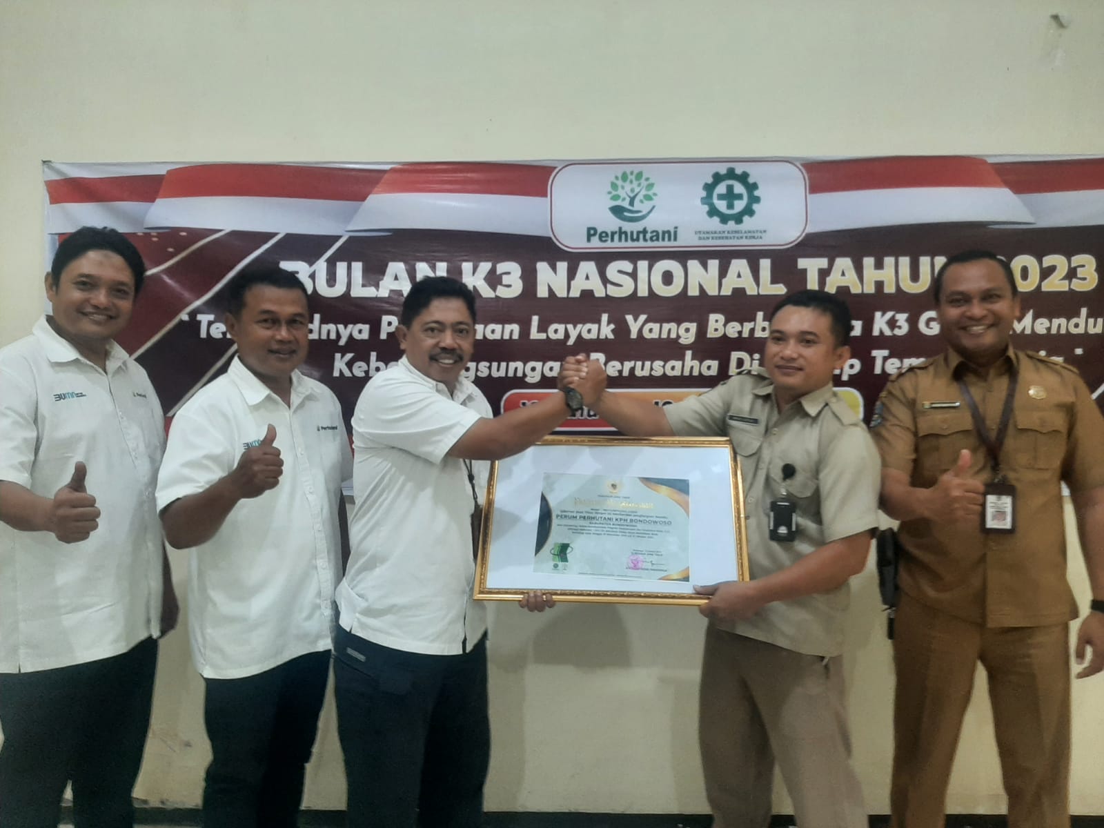 Piagam penghargaan dari Gubernur Jawa timur tersebut langsung di serahkan oleh Beny Puji Kurnianto selaku Tim verifikasi K3 dari Dinas Tenaga Kerja (Disnaker) Provinsi Jawa Timur kepada Administratur Perhutani Bondowoso Senin 30/1/23 bertempat di kantor Perhutani jalan Jend. A Yani 90 Bondowoso.