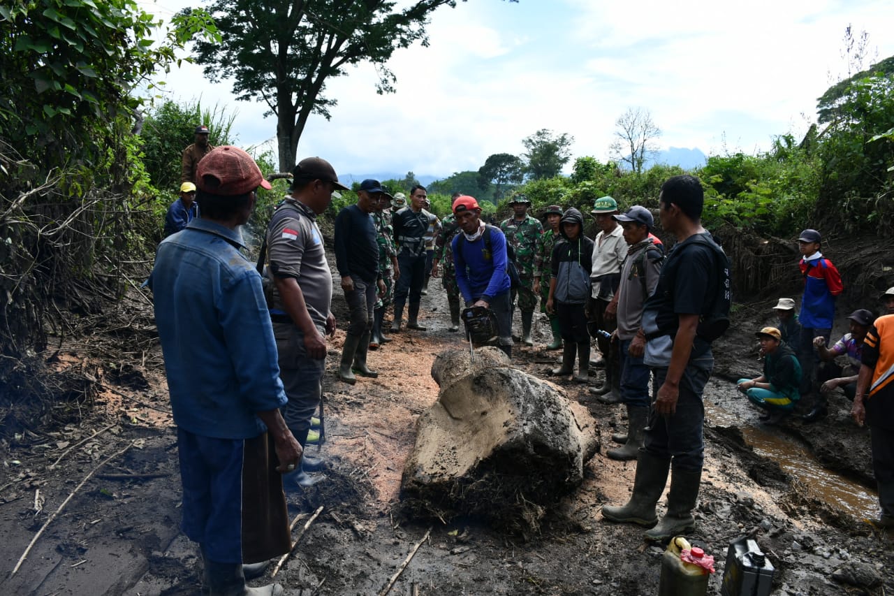Kapolres Bondowoso menjelaskan, personel TNI/Polri bersama relawan secara bergotong royong membersihkan rumah serta jalan dari lumpur agar bisa akses jalan bisa di lewati.