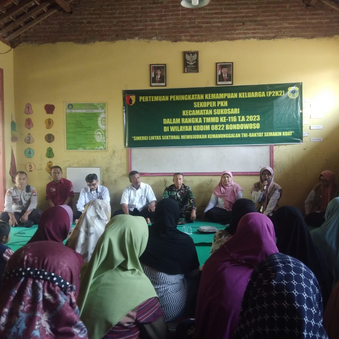 Bondowoso, KLIKTODAY.CO.ID – Dalam rangka kegiatan sasaran non fisik TMMD Reg 116 Kodim 0822 Bondowoso menggelar kegiatan Pertemuan Peningkatan Kemampuan Keluarga (P2K2) SEKOPER PKH bertempat di Sekolah PAUD Dusun Tenggir Desa Pecalongan Kecamatan Sukosari Kabupaten Bondowoso, Rabu (24/5).