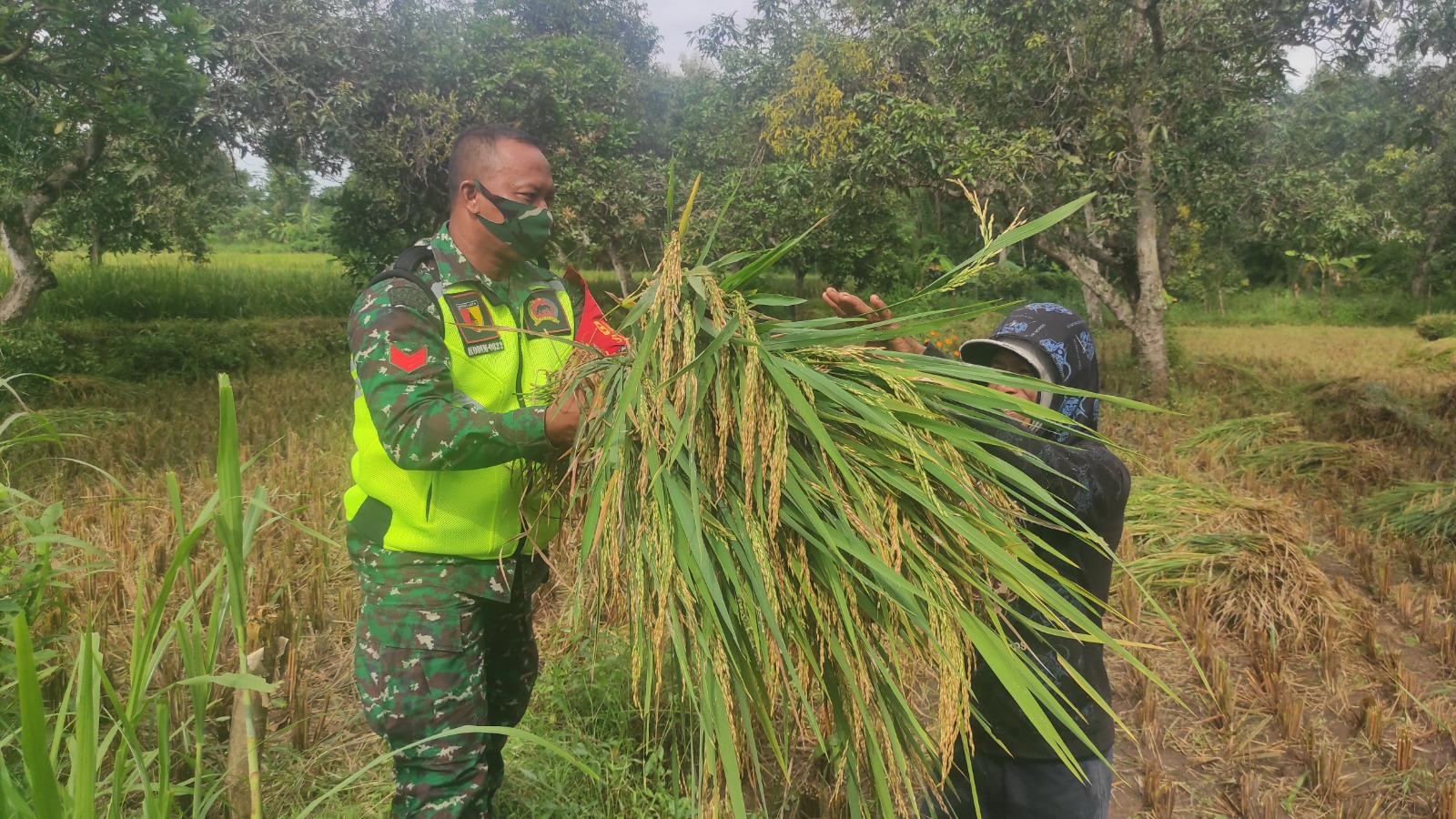 Koptu Slamet, salah satu Satgas TMMD Ke-116 Kodim 0822 nampak bersama petani membantu panen disalah satu sawah milik warga dan membantu angkat junjung gabah hasil panen.