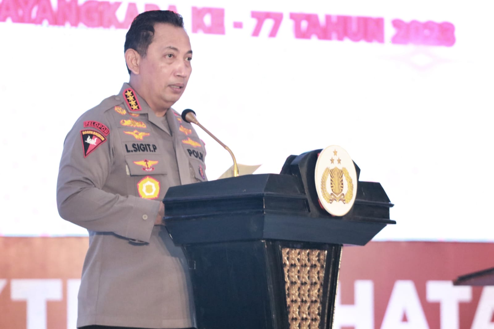 Kapolri Jenderal Polisi Listyo Sigit Prabowo bersama Pejabat Utama Mabes Polri dan didampingi Forkopimda Jawa Timur, secara langsung hadir dalam puncak kegiatan Bakti Kesehatan hari Bhayangkara ke-77 tahun 2023, di Gedung Mahameru Mapolda Jatim, pada Kamis (22/6/2023).