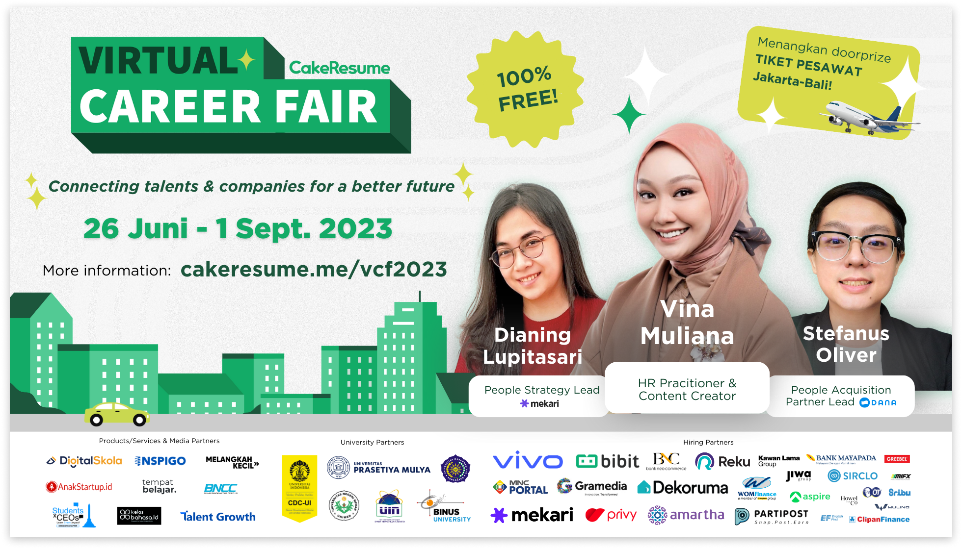 CakeResume Indonesia mengadakan Virtual Career Fair 2023 dari 26 Juni hingga 1 September 2023. Acara ini diselenggarakan secara gratis dan diikuti oleh lebih dari 40 mitra perusahaan ternama di Indonesia. VCF 2023 memberikan kesempatan kepada jobseeker untuk mendapatkan informasi lowongan kerja berkualitas, berinteraksi langsung dengan mitra perusahaan pada sesi Company Xpose, serta mengembangkan diri melalui sesi webinar. Pendaftaran bisa dilakukan melalui www.cakeresume.me/vcf2023