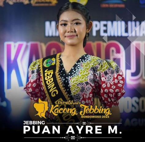 Bondowoso, PORTALBANGSA.CO.ID – Puan Ayre Mitrisnani Siswi SMAN 2 Bondowoso terpilih menjadi Jebbing di Malam Grand Final Pemilihan Kacong Jebbing Kabupaten Bondowoso Tahun 2023.