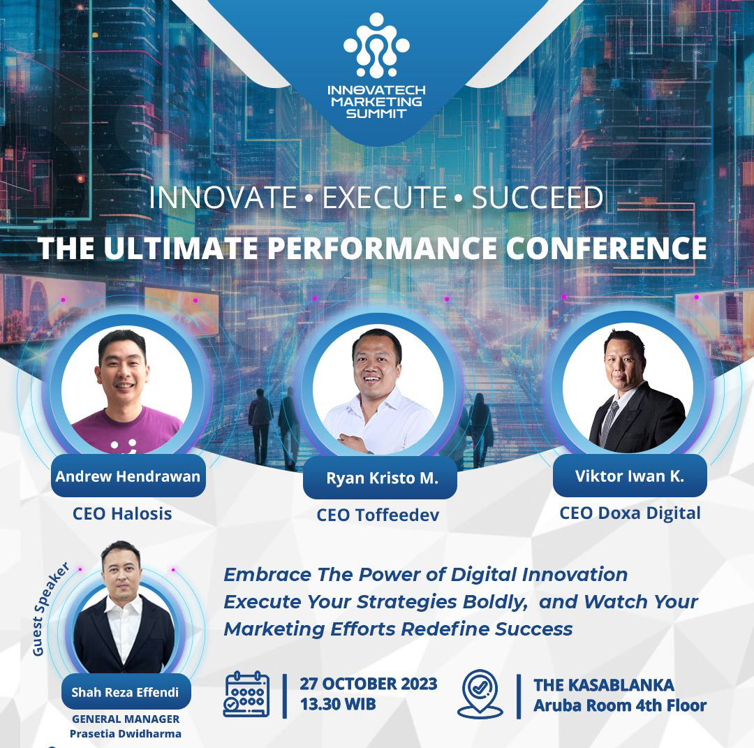 Acara Innovatech Marketing Summit merupakan pertemuan beberapa pemikir paling cemerlang di industrinya untuk berbagi wawasan dan strategi saat ini guna membentuk landscape pemasaran digital. Sementara misi Innovatech Marketing Summit memberdayakan bisnis dan pemasaran dengan tren dan alat terkini yang akan membawa kesuksesan di era digital.