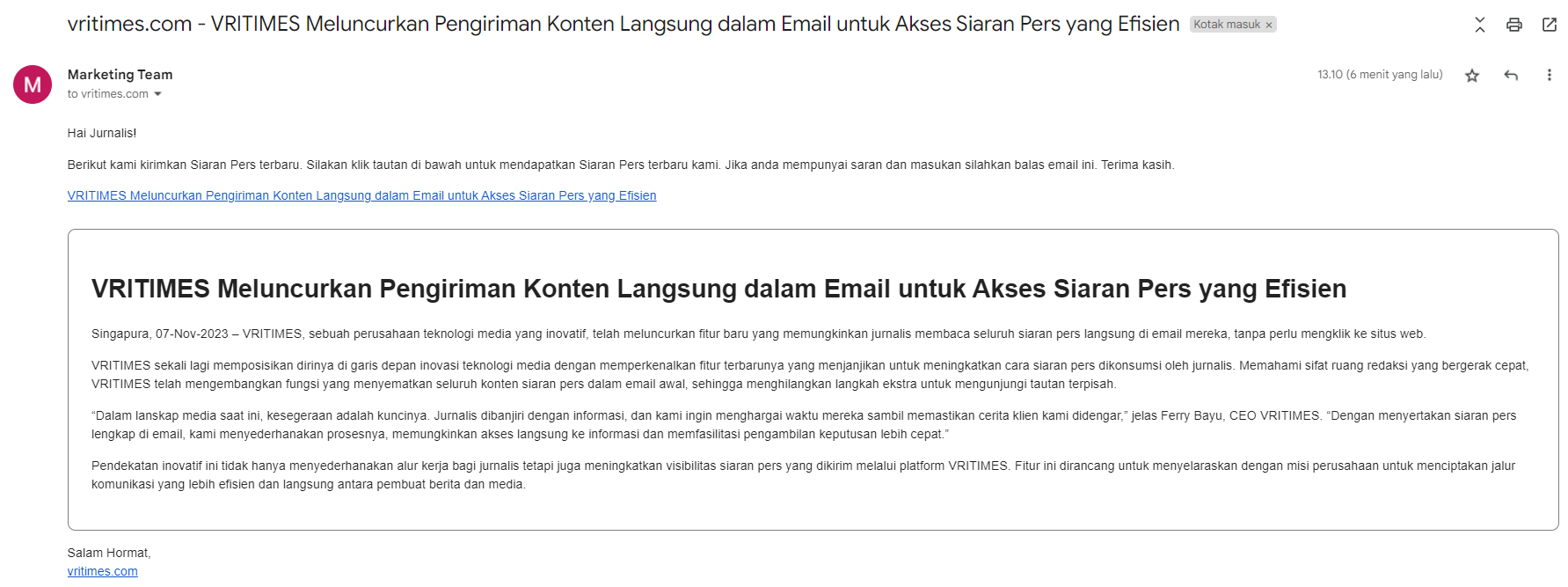 Jakarta, 07-Nov-2023, VRITIMES, perusahaan startup teknologi media, telah meluncurkan fitur baru yang memungkinkan jurnalis untuk membaca keseluruhan isi siaran pers langsung melalui email, tanpa perlu mengunjungi situs web.