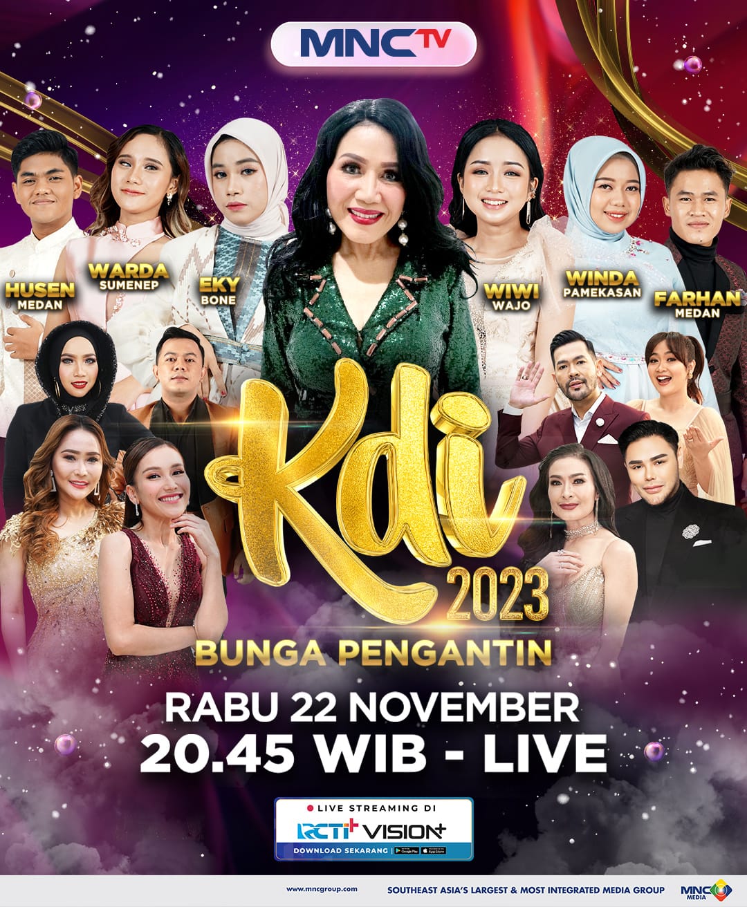 MNCTV menayangkan secara langsung Kontes KDI 2023 pada Rabu, 22 November 2023, pukul 20.45 WIB. Kontes KDI kali ini mengangkat tema ‘Bunga Pengantin’, yang dimeriahkan oleh Rita Sugiarto, Kevin Leon, dan Issey.
