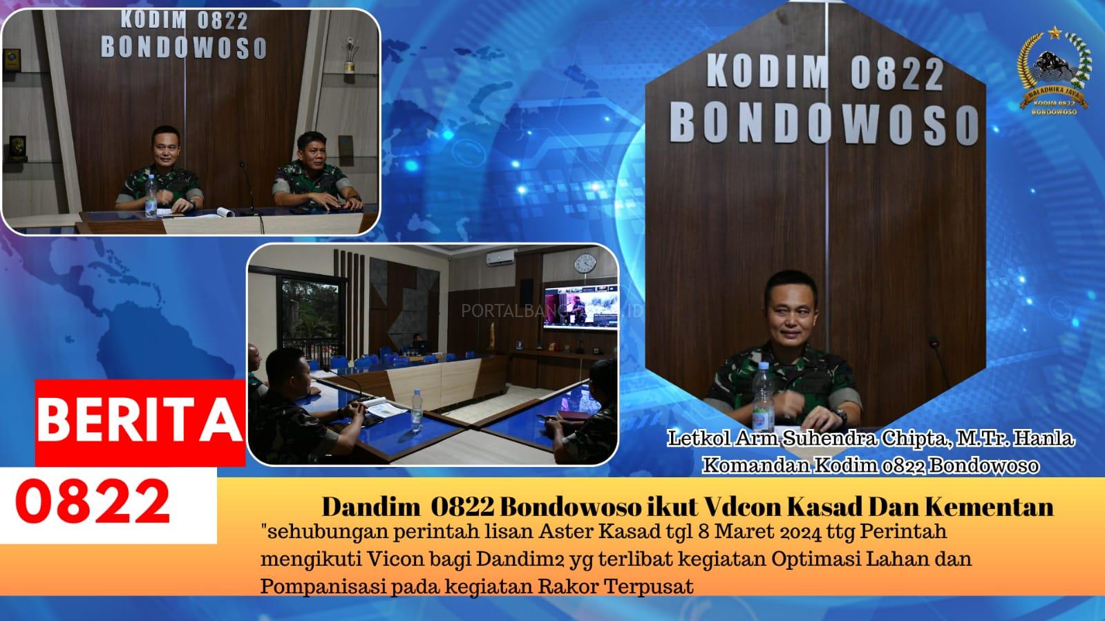 Bondowoso, Portal Bangsa. co.id – Mengikuti Komando atas, Dandim 0822 Bondowoso Letkol Arm Suhendra Chipta didampingi Kasdim 0822 serta Pa Staf, ikuti Rapat Koordinasi bersama Kepala Satuan Angkatan Darat (Kasad) Jenderal TNI Maruli Simanjuntak dan Pj Menteri Pertanian (Mentan) RI Amran Sulaiman secara Virtual di aula Makodim 0822 Bondowoso. Jumat, 8/3/2024.