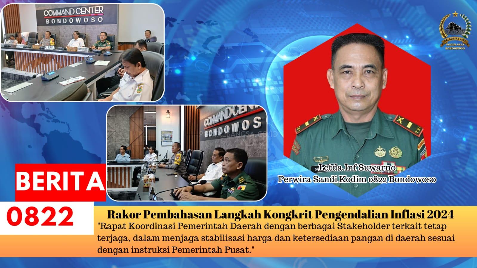 Bondowoso, PORTALBANGSA.CO.ID – Dandim 0822 Bondowoso diwakili oleh Pa Sandi 0822 Bondowoso Letda Inf. Suwarno menghadiri Rapat Koordinasi Pembahasan Langkah Kongkret Pengendalian Inflasi di Daerah Tahun 2024 secara Daring / Virtual pada Rabu pagi, (13/3/2024)