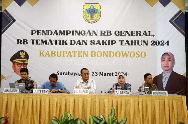 Bondowoso, PORTALBANGSA.CO.ID – Pj Bupati Bondowoso, Drs. H. Bambang Soekwanto, MM., beserta jajarannya menghadiri pendampingan Reformasi Birokrasi General, Reformasi Birokrasi Tematik, dan Sistem Akuntabilitas Kinerja Instansi Pemerintah (SAKIP), di hotel Java Paragon, surabaya, jum’at, (22/3/24).