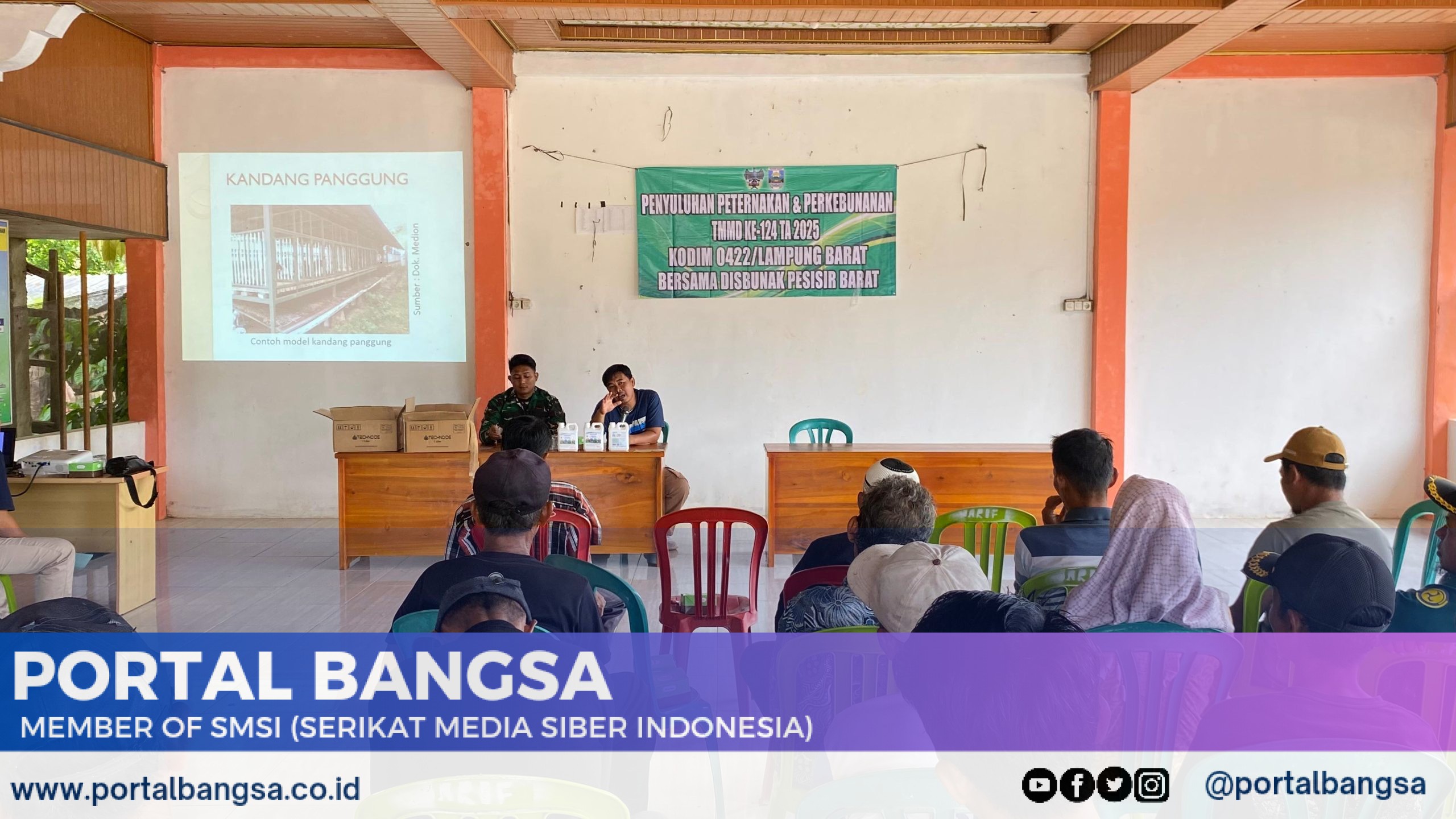 Lampung Barat, Portal bangsa. Co. Id– Dalam rangka mendukung pembangunan nonfisik di wilayah sasaran, Satgas TNI Manunggal Membangun Desa (TMMD) ke-124 Kodim 0422/Lampung Barat menggelar kegiatan sosialisasi peternakan kepada masyarakat Pekon Pemerihan, Jumat (16/5/2025).