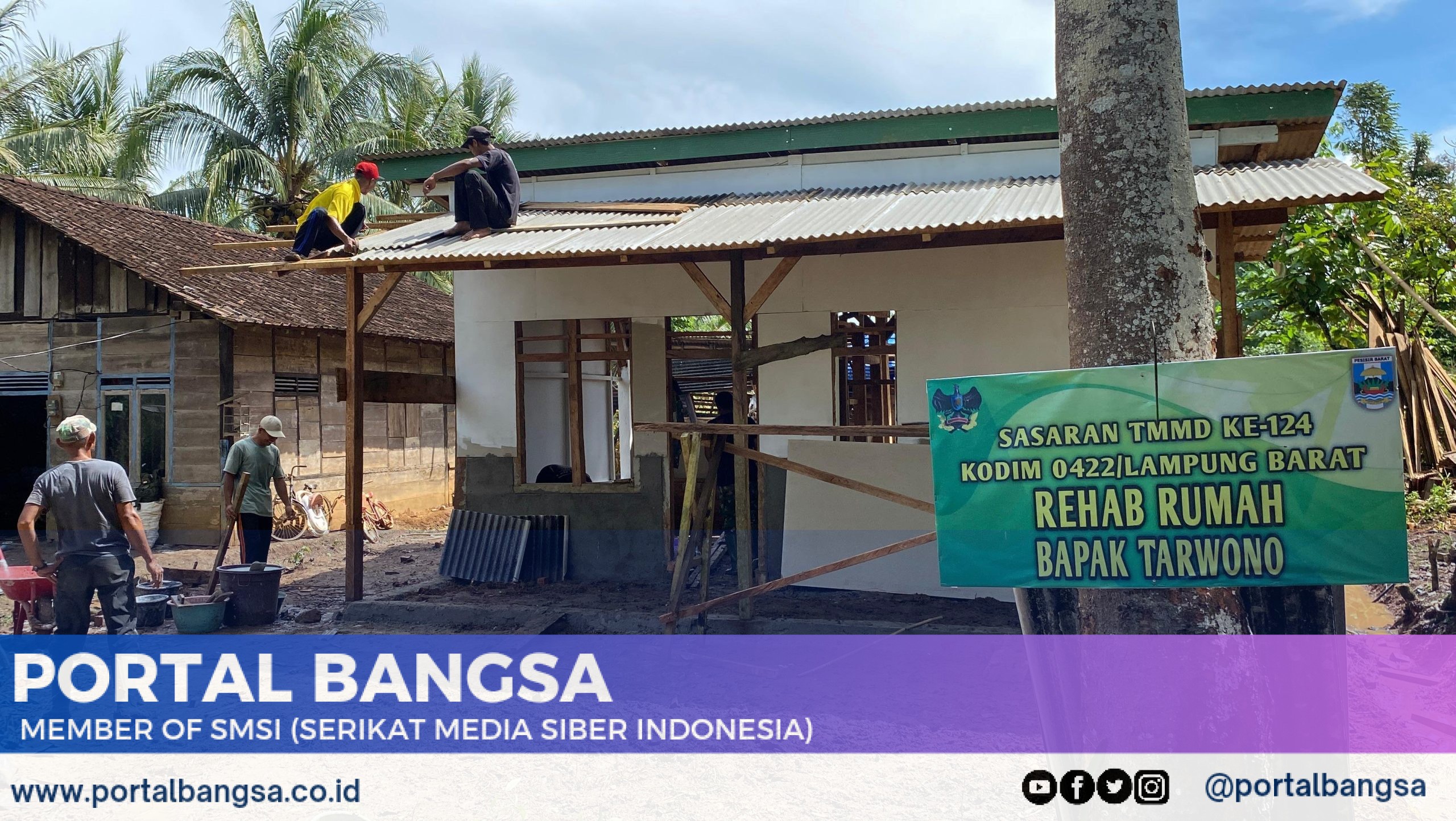 Lampung Barat, Portal bangsa. Co. Id – Satuan Tugas TNI Manunggal Membangun Desa (TMMD) ke-124 Kodim 0422/Lampung Barat terus mempercepat progres pembangunan di wilayah sasaran. Salah satu titik fokus adalah perehaban Rumah Tidak Layak Huni (RTLH) milik Bapak Tarwono, yang saat ini telah mencapai 51 persen.