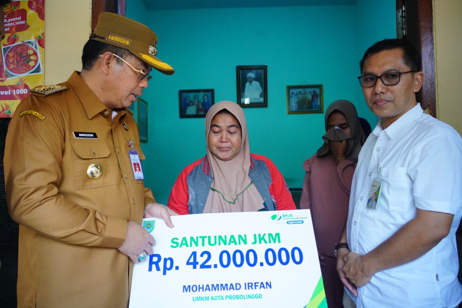 Pemerintah Kota Probolinggo bersama Badan Penyelenggara Jaminan Sosial (BPJS Ketenagakerjaan) menyerahkan santunan jaminan kematian (JKM) kepada para ahli waris peserta aktif BPJS dari kalangan nelayan, petani dan pelaku UMKM. Santunan tersebut diserahkan secara langsung oleh Wali Kota Probolinggo dr. Aminuddin di delapan lokasi berbeda, Selasa (22/7).