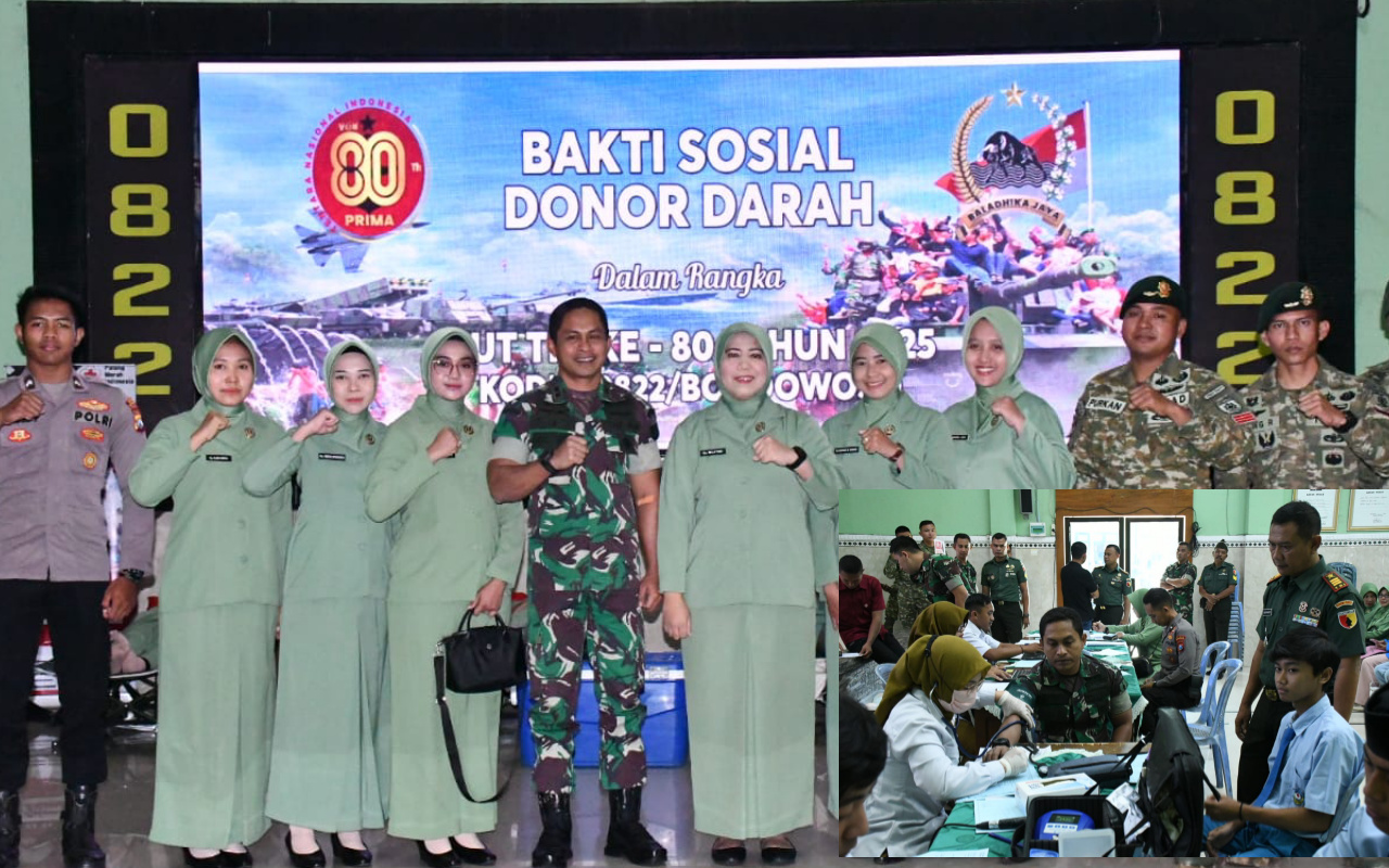 Bondowoso, http://Portalbangsa . Co. Id – Dalam rangka memperingati Hari Ulang Tahun (HUT) Ke-80 Tentara Nasional Indonesia (TNI) tahun 2025, Kodim 0822/Bondowoso bekerja sama dengan PMI Bondowoso menggelar kegiatan bakti sosial donor darah dengan tema “TNI PRIMA-TNI RAKYAT-INDONESIA MAJU”. Kegiatan berlangsung di Aula Jenderal Sudirman, Jl. Letnan Sutarman No. 06 Bondowoso, Rabu (24/9).